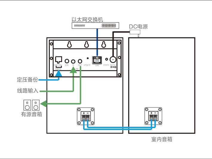 1 一体化壁挂式设计,整合网络音频解码,数字功放及音箱;