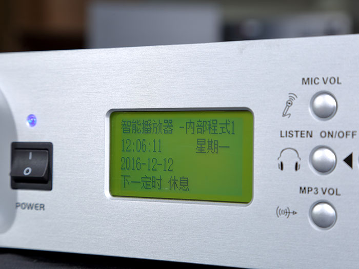 大屏幕中文显示,兼容MP3、WAV、WMA等格式,USB接口下载歌曲,话筒录音,内置监听扬声器;可编四套程序,每套程序可设置225时间段,相互之间可随意切换及复制。程序停电保护,内置全套校园广播歌曲、音乐钤声,内置可控2路电源、6分区,标准配置4G内存,智能音乐播放器采用世界最先进的微电脑控制技术。将广播自动分区播放、外部音频和麦克风录音存储等先进功能综合为一体。内存大小由你选择: (分别TF卡设计),成为广播设备的典范之精品,达到国内领先水平。广泛适用于校园自动广播音乐打铃、外语广播教学听力考试系统。